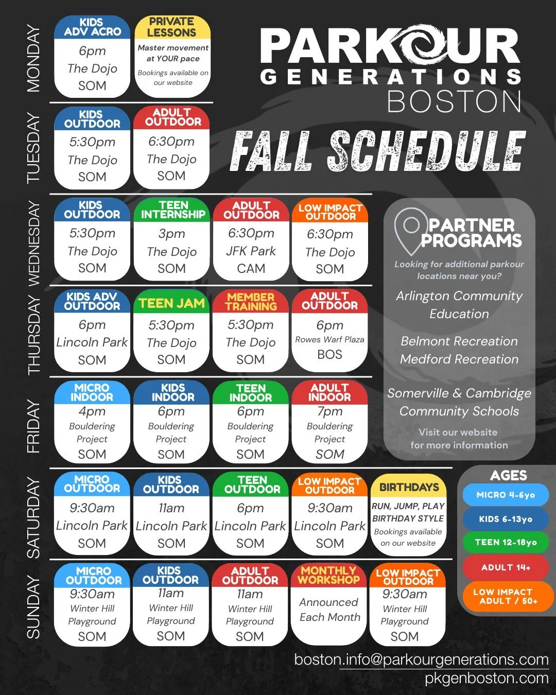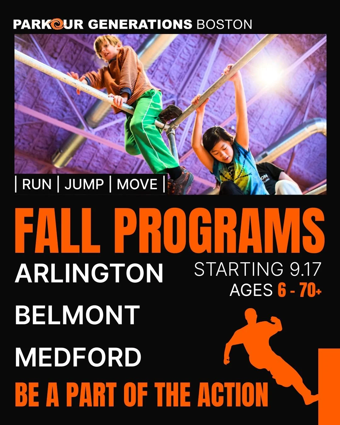 LEARN - Come join us at one of the events listed below and test out the course. Our coaching team will be on hand to walk you through the route, help you find creative ways to move your body through the course, and support you through any of the mental obstacles that you encounter. We’ll also be there to teach you some useful parkour techniques to add! Already know the basics? Our team will be on hand to give pointers and help you improve!