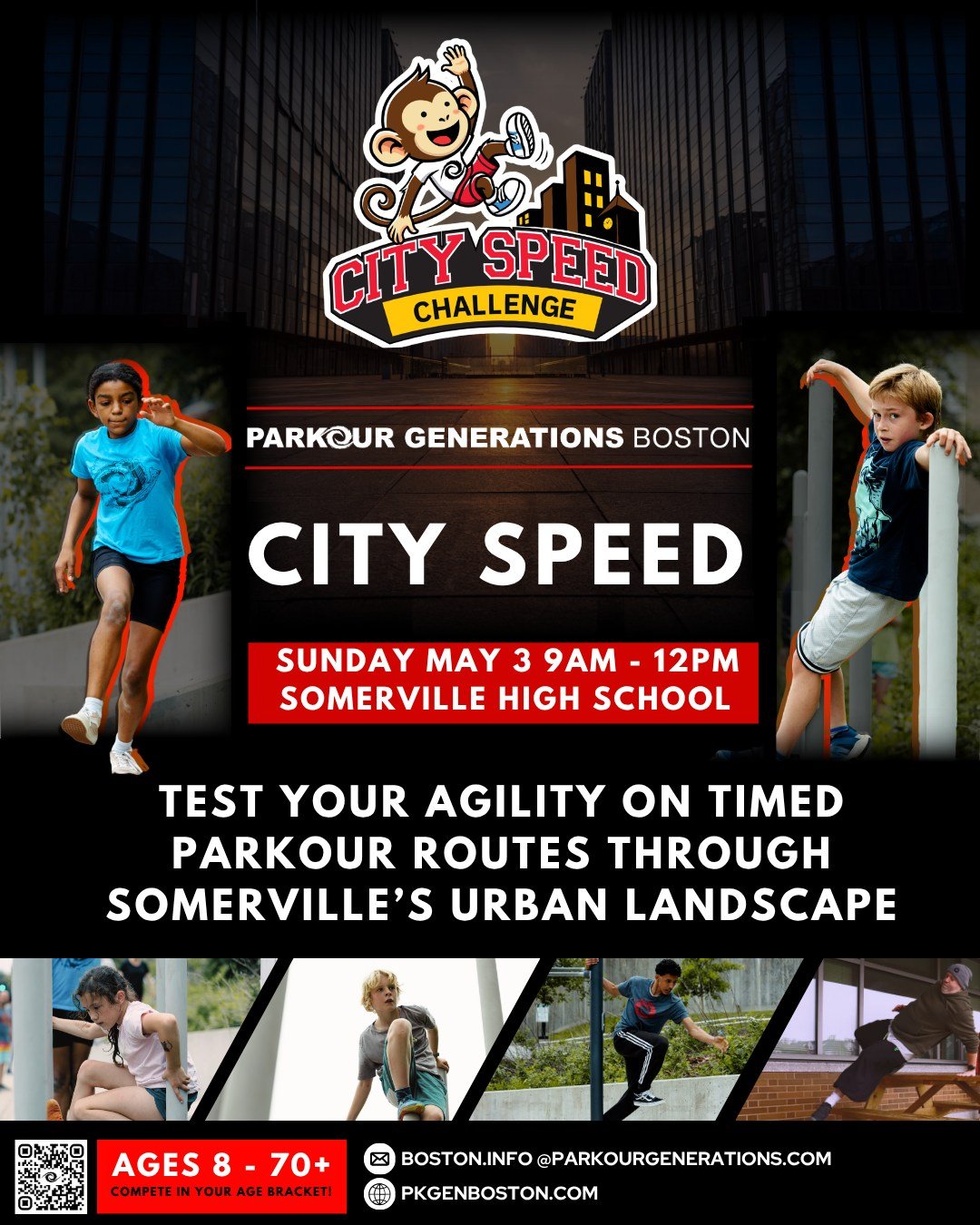 - A small bag if necessary, although you should be able to jog with it (Note: Parkour Generations Boston takes no responsibility for the safe-keeping of items)